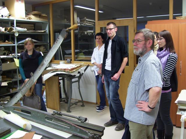 Nemenší zájem byl mezi účastníky také o návštěvu restaurátorského pracoviště. Exkurzi odborně zaštítil pan Svatopluk Ryška, který začal vyprávěním o tom, proč knihy přicházejí do restaurátorské dílny. Jeho pracoviště není určeno pro novodobé knihy, ale pro staré vzácné exempláře. Řemeslo restaurátora je náročné, kromě perfektní znalosti knihařských dějin (na knihu z 18. století nepatří vazba ze století dvacátého), složení lepidel a dalších chemických látek, se do něj promítá také profese švadleny při šití vazeb či specialisty na kožedělnou výrobu.