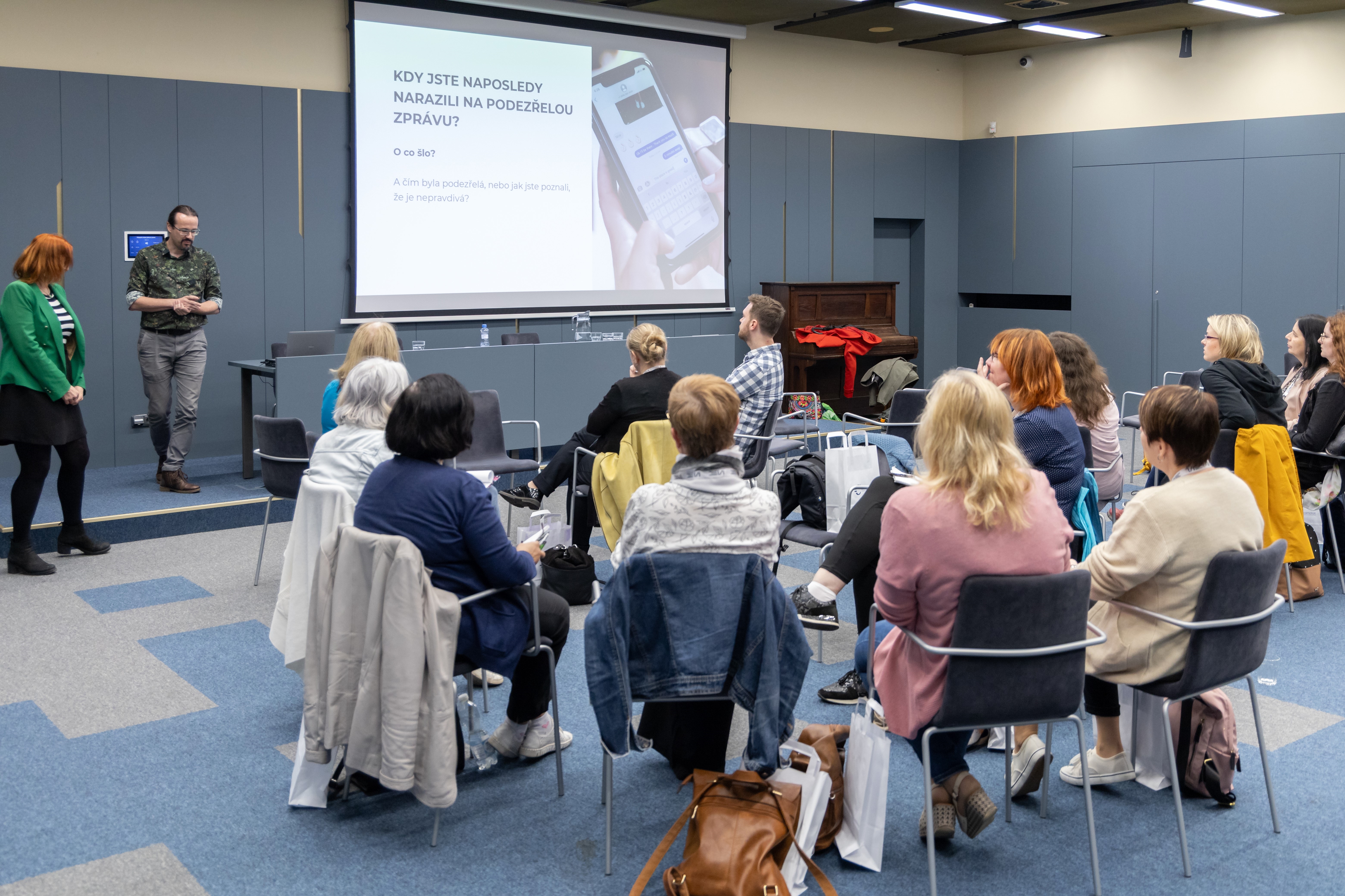Workshop s názvem Důvěřuj, ale prověřuj byl ukázkou kritického myšlení v praxi a byl zaměřen na problematiku dezinformací a rozvoj mediální gramotnosti. I když nakonec nemohla ze zdravotních důvodů přednášet lektorka Mgr. Pavlína Lišovská, na kterou jsem se osobně moc těšila, podařilo se pořadatelům zajistit náhradu v podobě lektora, který má také dlouholetou praxi v oblasti mediálního vzdělávání. Ten nám představil řadu technik, jak rozpoznat manipulativní obsah, falešné zprávy či podvržené fotografie. Součástí workshopu byly i praktické ukázky, kdy jsme analyzovali konkrétní články, videa a příspěvky ze sociálních sítí. Velkým přínosem byla i diskuze o tom, jak téma mediální gramotnosti přiblížit různým cílovým skupinám – od dětí přes seniory až po dospělé. Tento workshop mě inspiroval k tomu, abych uspořádala besedy s touto tematikou v naší knihovně pro veřejnost i žáky naší ZŠ.