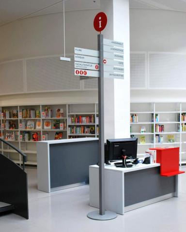 Knihovna klade důraz na vystavování knih na policích tak, aby to lidi zaujalo. Některé knihy jsou vystaveny obálkou dopředu, oddělení s multimédii se podobá obchodu z CD a deskami. Úplně zvlášť jsou vyčleněny bestsellery. Ty jsou zpracovávány urychleně a jsou vystaveny na polici za vchodem do knihovny. Čtenáři mají možnost si tyto bestsellery vypůjčit na 3 týdny za 2 eura. Seznam bestsellerů je určen podle časopisu Spiegel. Jakmile se kniha ocitne mimo přední žebříčky, přechází do běžného fondu. Veškeré finanční operace v knihovně probíhají výhradně přes platební automat a obsluha vůbec nepřichází do kontaktu s penězi. Zajímavostí je také propojení s kavárnou – do čítárenského koutku novin a časopisů je možné donést si nápoje z vedlejší kavárny, takže si čtenáři mohou vychutnat například denní tisk u ranního cappuccina. Knihovna nabízí také půjčování e-knih systémem DiViBib. Náklady na tento systém jsou cca 40 000 EUR ročně pro konsorcium 5 knihoven. Tento systém funguje tak, že jednu knihu v jeden čas může mít jen omezený počet uživatelů, doba výpůjčky je 3 týdny.
