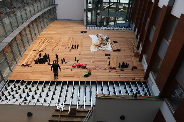Sotva si stavební firma do foyer dovezla potřebný stavební materiál, změnil se harmonogram uvolňování a knihovny mohly své služby obnovit již 27. dubna. I tuto situaci jsme však zvládli; předposlední dubnový den se čtenářům zpřístupnila půjčovna pro výdej absenčních výpůjček a současně v atriu pokračovaly truhlářské práce. Knihovna musela být na pět dní v květnu znovu uzavřena, aby bylo možné instalovat nové zádveří ve veřejné části. Na konci května byly otevřeny i studovny a čtenáři proto takřka v přímém přenosu mohli sledovat postup prací v atriu. Začátkem června rovněž začaly přípravy na pokládku koberců ve studovnách. Plošné uzavření bylo sice zažehnáno, ale bez krátkodobého omezení provozu v jednotlivých studovnách a přesunutí výdeje prezenčních výpůjček se neobejdeme. Nicméně doufáme, že naši čtenáři pro tyto kroky najdou pochopení, ostatně je to vykoupeno možností mít pouze s menšími omezeními otevřeno celé léto a chopit se tak příležitosti dohnat ve studiu jarní karanténu.