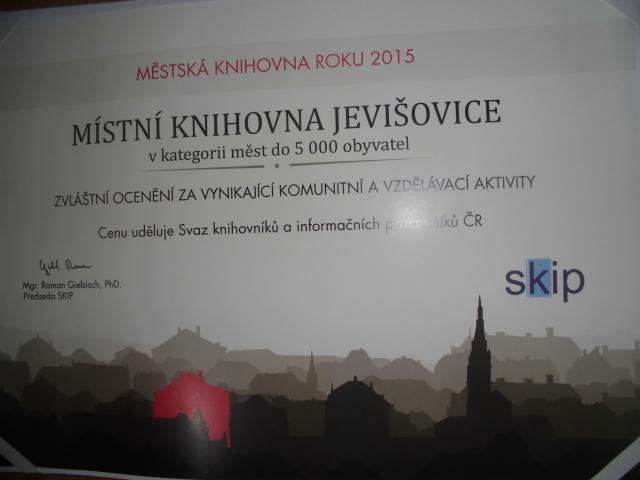 V letošním roce se v soutěži Městská knihovna roku 2015 knihovna Jevišovice umístila na prvním místě v kategorii měst do 5.000 obyvatel a díky tomuto umístění získala zvláštní ocenění za vynikající komunitní a vzdělávací aktivity. Ocenění převzali starosta města Jevišovice Mgr. Pavel Málek a knihovnice Zdenka Komůrková 8.10. 2015 v Zrcadlové kapli Klementina v Praze. Dle slov knihovnice Zdenky Komůrkové patří ocenění čtenářům knihovny Jevišovice, bez kterých by byla knihovna jen prázdným prostorem. Tímto děkuje všem čtenářům i ostatním návštěvníkům knihovny či akcí, knihovnou pořádaných, za jejich přízeň. Poděkovat by také chtěla starostovi Jevišovic a všem zastupitelům za podporu knihovny. Velký dík také patří regionálnímu oddělení knihovny Znojmo, vedenému Mgr. Janou Sikorovou a také Moravské zemské knihovně, zejména potom Mgr. Adéle Dilhofové, za dlouhodobou podporu. Knihovna Jevišovice je duší města.
