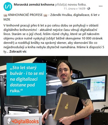 Začátkem letošního roku jsme v Moravské zemské knihovně pro své čtenáře a naše sledující na sociálních sítích Facebook a Instagram spustili nový seriál s názvem „Knihovnické profese“. Na počátku projektu byla myšlenka seznámit čtenáře s pestrou škálou zaměstnanců rozmanitých a zajímavých profesí, kteří pracují v útrobách knihoven, které navštěvují. Ano, čtenáři se setkávají běžně se zaměstnanci ve studovnách nebo na výpůjčním oddělení, ale do jaké míry mají povědomí o těch dalších typicky knihovnických profesích, které zůstávají skryty před jejich zraky, ale jsou současně nezbytné pro správné fungování knihovního soukolí? Čím se například zabývá akvizice, mapový kurátor, lidé na oddělení adjustace, jakou práci odvádí oddělení katalogizace nebo co zajímavého může o své práci říci kolegyně z revize fondů, knižní restaurátor nebo rešeršistka? To vše bylo pomyslnou hozenou rukavicí, kterou se oddělení komunikace rozhodlo zvednout a která dala za vznik pravidelnému čtvrtečnímu seriálu. A jakou má seriál podobu?