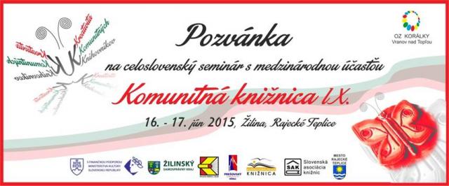 Ve dnech 16. – 17. června 2015 proběhl v Krajské knihovně v Žilině a v Rajeckých Teplicích celoslovenský seminář Komunitní knihovna IX. Po slavnostním zahájení pronesl úvodní příspěvek Quo vadis knižnica profesor Milan Konvit. Odpoledne zahájila přednáškový blok doktorka Libuše Foberová, rovněž ze Slezské univerzity v Opavě. Představila prostřednictvím pojmové mapy komunitní prostředí veřejných knihoven. Následovaly příspěvky z praxe knihoven na Slovensku, například o biblioterapii v knihovnách hovořila magistra Lívia Koleková z Knižnice Juraja Fándlyho v Trnave.