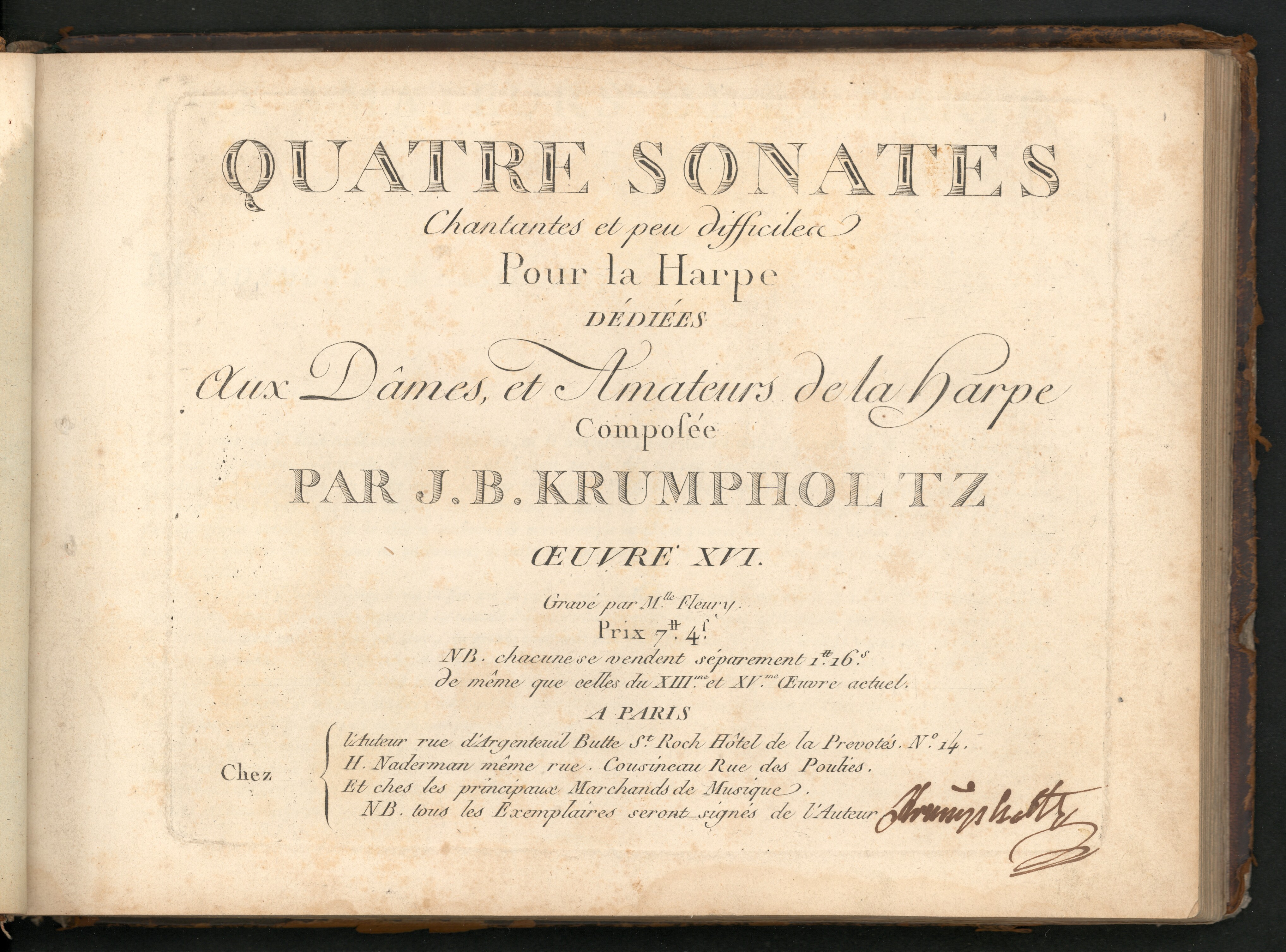 Na výstavě návštěvníkům také blíže představíme unikátní konvolut tisků z fondu Moravské zemské knihovny. Vzhledem k právu povinného výtisku, které měla Francouzská královská knihovna, později národní knihovna, již od 16. století, můžeme právem předpokládat, že její sbírky obsahují největší fond ve Francii vydaných hudebnin. Přesto se některé tisky nedochovaly. K nim patří sbírka čtyř zpěvných a nepříliš obtížných sonát pro harfu, op. 16 (Quatre sonates chantantes et peu difficiles) z roku 1789 pražského rodáka Jana Křtitele Krumpholtze. Ta je výjimečná tím, že ve své úvodní dedikaci obsahuje na čtyř stranách detailní životopis autora následovaný katalogem jeho k tomu datu zkomponovaných děl. Tento tisk se dochoval pouze ve sbírkách Moravské zemské knihovny a ve dvou dalších knihovnách (ve švýcarském Winterthuru a italské Ostiglii). Tisk z našeho fondu je plně zdigitalizovaný a přístupný hudebníkům a badatelům po celém světě. V katalogu výstavy přinášíme na základě tohoto tisku plný český překlad Krumpholtzova životopisu, který se jinak dochoval pouze v neúplné podobě vydané posmrtně jeho žákem.