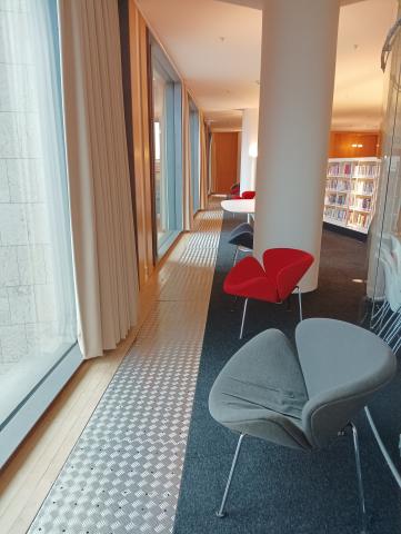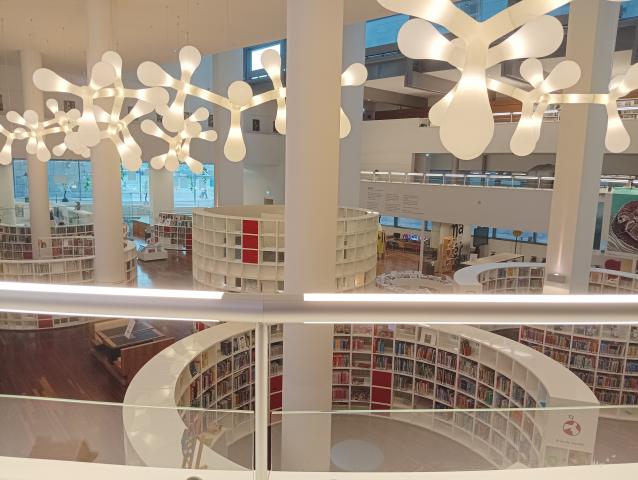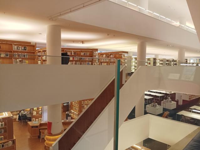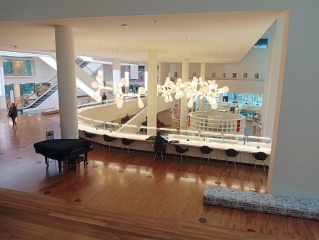 Přestože knihovna disponuje obrovským otevřeným prostorem, působí velmi útulně a uživatelsky přívětivě. Jednotlivá patra jsou propojena eskalátory a jsou rozdělena do různých částí s odlišnými regály, stoly, osvětlením apod., čímž vzniká řada opticky oddělených zón a zákoutí. Velmi příjemně působí kombinace moderního a retro nábytku. Každý návštěvník si tak může vybrat místo pro čtení či studium podle svých preferencí. Speciální funkci má první podzemní podlaží, kde je umístěno dětské oddělení se zvláštními kruhovými regály. Ve zvýšeném přízemí (mezaninu) je k dispozici kavárna spojená s čítárnou novin a časopisů, kde je vystaveno několik set titulů. V budově je také divadlo, konferenční sál, výstavní prostory atd.