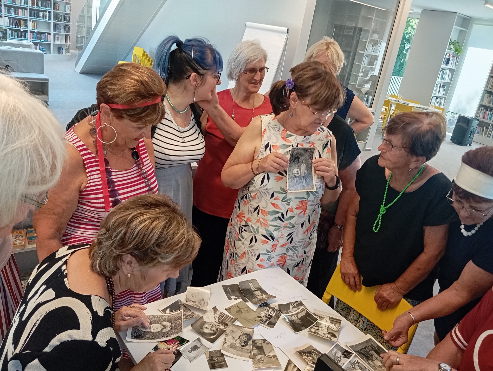 K reminiscenční terapii jsme vyzkoušely fotografie z dětství. Každá z žen přinesla svou či své fotografie z dětství, daly je na stůl a navzájem se hádalo, kdo je kdo. Bylo krásné vidět a slyšet vzpomínky, které tato aktivita vyvolávala. Nebyly by to zlatá 60. léta, abychom neuspořádaly tzv. čaje. Čaje probíhaly v neděli v 17 hodin a tancovalo se. Nepil se čaj, ale ovocné limonády. My jsme se oblékly, nalíčily, učesaly ve stylu 60. léta a užily si to. Hřebem týdne byla módní přehlídka a představení v dobových plavkách, to nás s kolegyní můžete vidět na fotografii. Neochudily jsme naše účastnice tábora o knihovnický kvíz, který sice nebyl retro, ale mozkové buňky nám procvičil. V poslední den jsme si objednaly pizzu a závěrečně zhodnotily tábor. Během celého týdne jsme pravidelně na našich sítích informovaly děti a vnoučata o činnosti z tábora a o tom, že jsou všichni v pořádku.