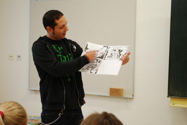 Komiksem provedl děti Lukáš Divácký, který žije v Brně. Věnuje se underground komiksu, grafice, designu. Je spoluzakladatelem grafického studia Hdartworks. Přispívá do časopisu Bubble Gun. Jeho kresby jsou určeny spíše dospělým čtenářům, je však nakloněn různým druhům spolupráce. Vedl workshopy o komiksu jako následovníku nástěnných maleb. Připravil si krátký příběh o chlapci, který touží po psovi, ale od rodičů dostane rybku. Děti si ho zkusily dotvořit. Jejich kreativita byla bezmezná. Projevily nejen smysl pro detail, ale i smysl pro humor, např. když ryba skončila na pánvi a chlapec přece jen dostal psa. Z komiksu pochází logo projektu – pravěký chlapec Pazourek. V knihovnách a školách bylo použito také jako omalovánka. Uspořádáno bylo 5 workshopů.