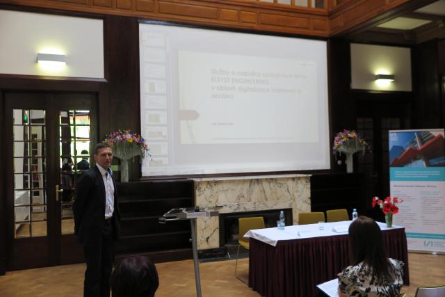 S informací o aktivitách a činnosti firmy Elsyst Engineering vystoupil ing. Martin Noha. Firma Elsyst Engineering dlouhodobě spolupracuje na digitalizačních projektech s Národní knihovnou. Knihovnám poskytuje komplexní služby v oblasti mikrofilmování, digitalizace mikrofilmů a digitalizace papírových dokumentů různých formátů. Zajišťuje digitalizaci 3D objektů a dodávky kompletně vybavených digitalizačních pracovišť. Webové stránky s nabídkou služeb knihovnám zde.