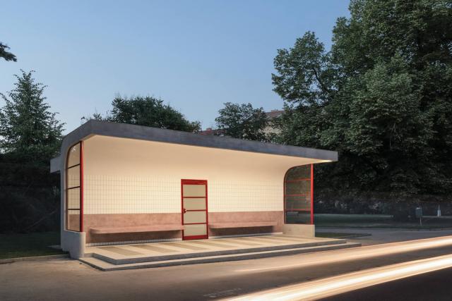 V rámci prezentace ve foyer Moravské zemské knihovny jsme představili osobnost Tomáše Rusína, jeho nejvýznamnější projekty, které v Brně v rámci ateliéru RAW realizoval. Čtenáři tak mohli zhlédnout fotografie liturgického prostoru Kostela sv. Augustina, Café Placzek, zastávky na Obilním trhu (na fotografii), bytových domů Kadetka či Obzor, nebo také Vilu Münz.