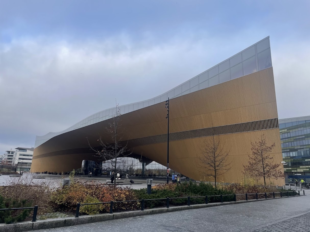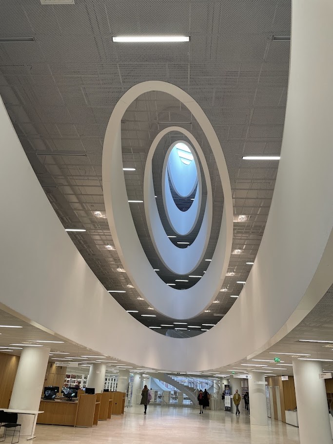 Naše cesta začala v Univerzitní knihovně (budova Kaisa Talo), která funguje jako ústřední knihovna pro helsinskou univerzitu a je umístěna v centru města. Budova s velkorysým prostorem a impozantním designem, která získala řadu architektonických ocenění, nás uchvátila hned po vstupu. Otevřená prosvětlená koncepce interiéru se spoustou studijních i odpočinkových zón nabízí studentům útulné prostředí, kde můžou trávit čas. Byly jsme překvapeny absencí tradičních pultů s knihovníky – studenti zde mají k dispozici samoobslužné systémy a poradenské služby jsou řešeny spíše v roli facilitátorů než striktních správců knihovny. Líbily se nám i interaktivní prvky, jako možnost hlasovat pro novou podobu části knihovny či podílet se na společné tvorbě velkého puzzle.