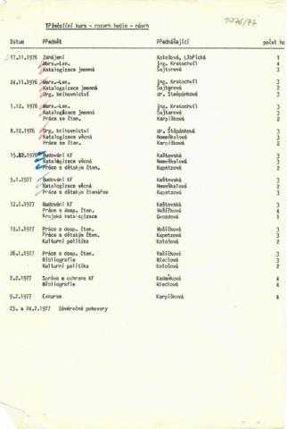 Cituji krátkou vzpomínku účastnice knihovnického kurzu: „V září 2001 jsem nastoupila do krajské knihovny jako čerstvá absolventka vysoké školy. Vystudovala jsem českou filologii a historii, což se v mé práci hodilo, ale o knihovnictví jsem pochopitelně nevěděla nic. Hned na podzim jsem proto byla vyslána na rekvalifikační kurz, který byl v mé knihovně pořádán. Zpětně kurz vidím jako nejrychlejší cestu k získání povědomí o knihovnické práci. Velice kladně hodnotím především to, že přednášející byli přímo lidé z praxe, kteří do kurzu zařazovali opravdu potřebné a aktuální informace“.