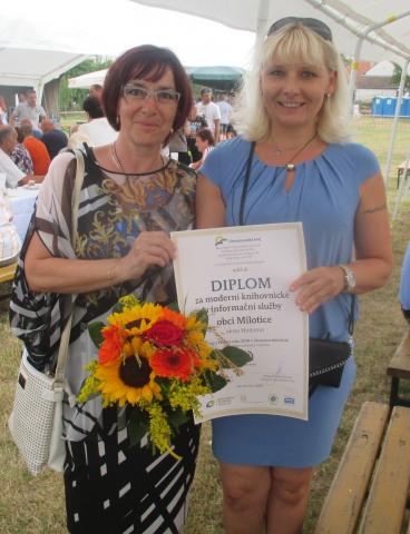 Diplom za moderní knihovnické a informační služby byl v tomto roce udělen Místní knihovně Milotice. Knihovna je umístěná v rekonstruovaných prostorách a je bezbariérová. Vedoucí knihovny, paní Jitka Úradníková, dlouhodobě a systematicky pracuje se všemi čtenáři své malé knihovny. Svědčí o tom i ocenění z roku 2012, které získala jako nejlépe pracující knihovna okresu Hodonín. Více informací lze získat také na webové stránce. Diplom byl předán 14. 7. 2018 na slavnosti v obci Hrušky a umožnil tak knihovně postup do celostátního kola Knihovna roku 2018 za Jihomoravský kraj. S napětím budeme očekávat výsledky, které budou zveřejněny v Týdnu knihoven v nádherném prostředí Zrcadlové kaple Národní knihovny v Praze.
