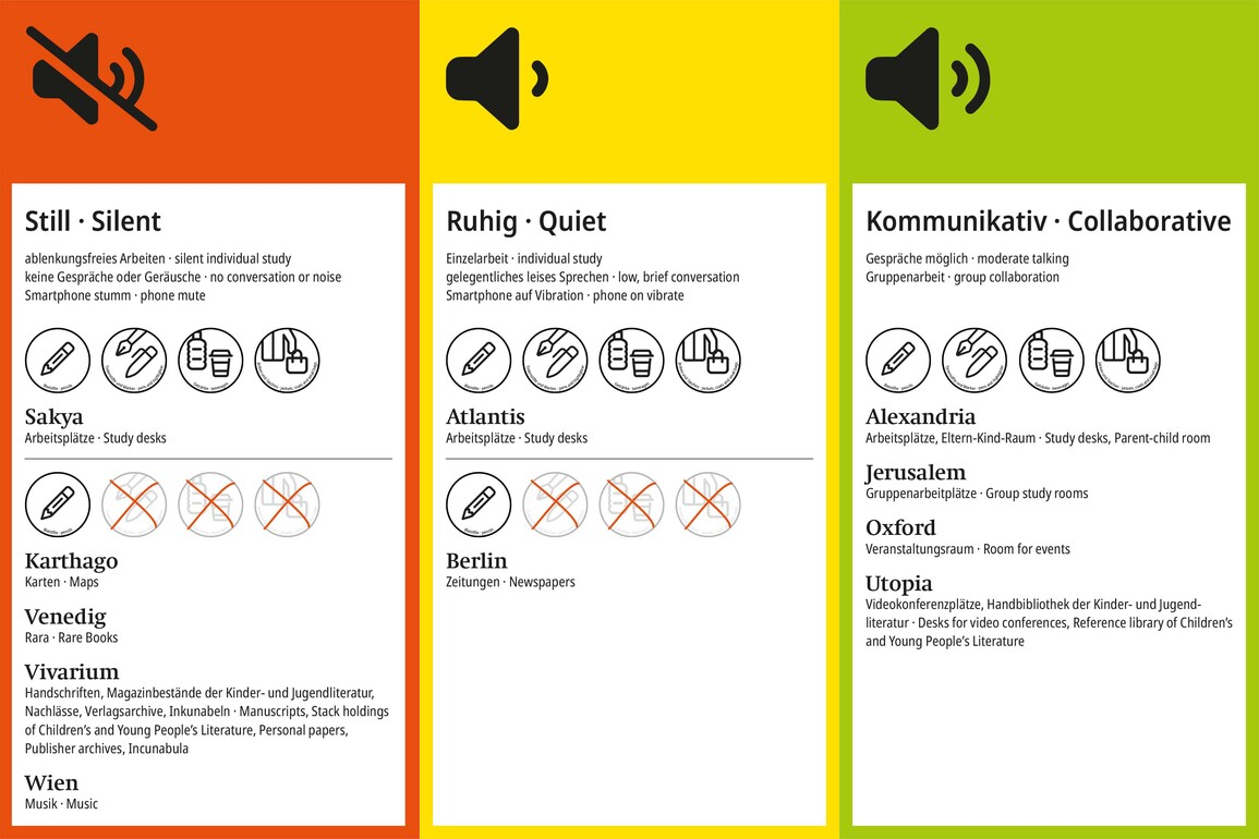 Hned za tímto vstupní bodem je návštěvník informován o systému zónování klidových a rušnějších částí knihovny[2]. Každá ze studoven má své jméno a její provoz se řídí jedním ze tří typů zón, které mají jednotné barevné označení: